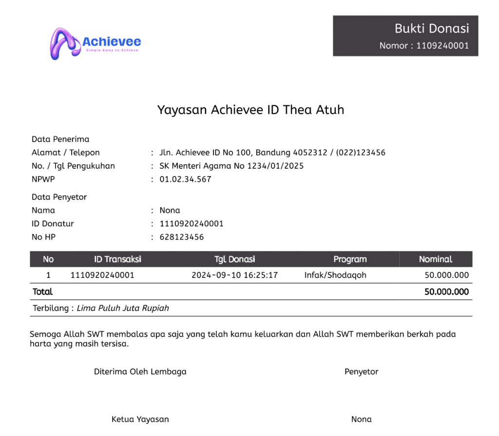 Fitur bukti donasi memungkinkan cetak bukti donasi / transaksi langsung dan kustomisasi tampilan dengan logo, pesan, atau detail tambahan dalam bentuk file PDF