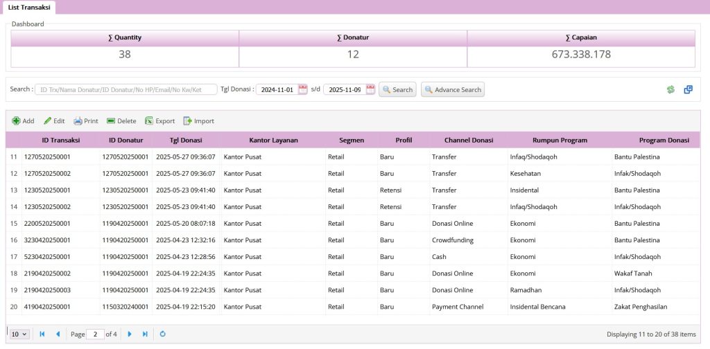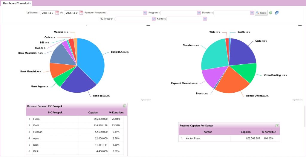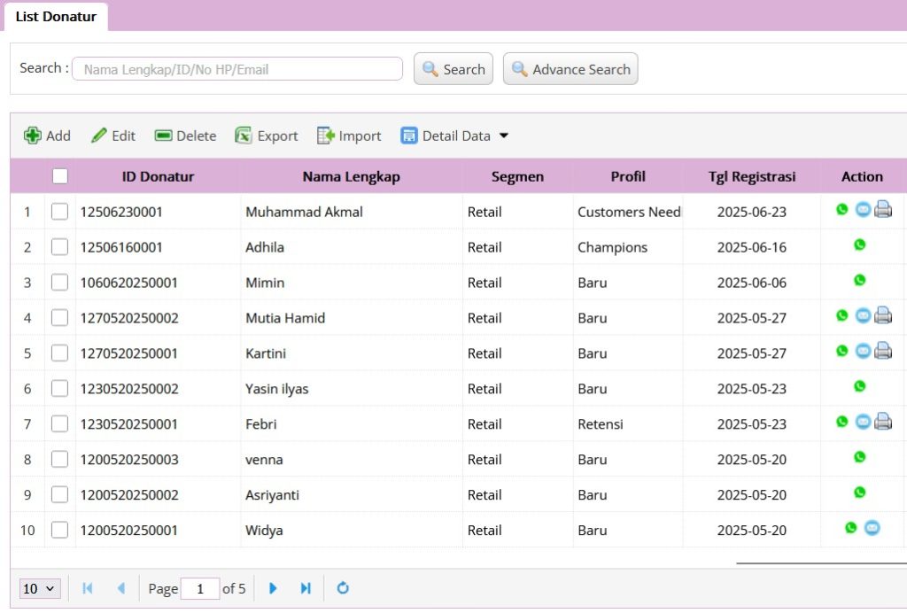 Input data donator dengan cepat dan akurat untuk memudahkan follow-up dan analisis program loyalitas CRM. Data tersimpan terpusat dengan management yang profesional