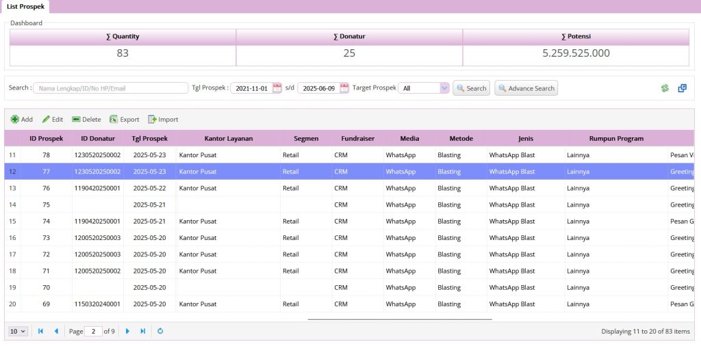 Kelola data prospek dan semua peluang yang ada, dapat mudah di entry secara cepat dan massal. Calon donatur juga dapat dikelola dengan mudah, cepat dan informatif